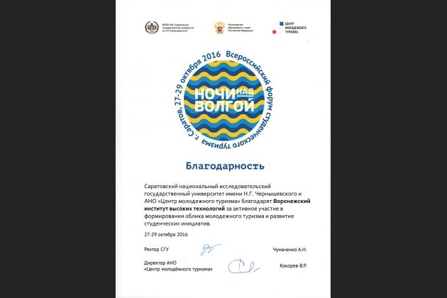 Преподаватель ВИВТ Светлана Геннадьевна Федорова и студент 4 курса Владислав Косенков стали участниками второго Всероссийского форума по студенческому туризму «Ночи над Волгой», который прошел в Саратове с 27 по 29 октября. Форум «Ночи над Волгой» собрал представителей более 40 образовательных организаций из 32 регионов России.