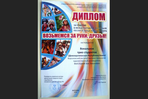 Воронежский институт высоких технологий был достойно представлен на фестивале вокальным трио студентов из Демократической Республики Конго, исполнившим две композиции: «Конго Набисо» на национальном языке Конго лингала и On ecrit sur les murs на французском языке.