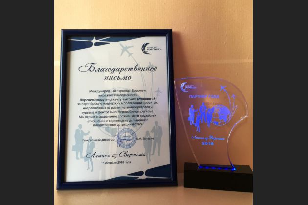 По итогам года руководство аэропорта отметило своих постоянных партнёров, статуэтку и диплом получил и Воронежский институт высоких технологий в лице ректора И. Я. Львовича.