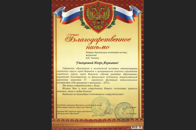 Благодарственные письма и грамоты на имя ректора и коллектива ВИВТ