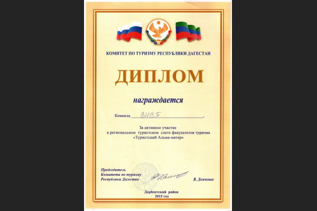 Комитет по туризму Республики Дагестан провел слет факультетов туризма «Туристский Альма-матер», посвященный 70-летию Победы в Великой Отечественной Войне. Соревнования прошли с 1 по 4 октября в с. Мичурино Дербентского района на базе ГБУ РД ТЦ «Золотые пески».
