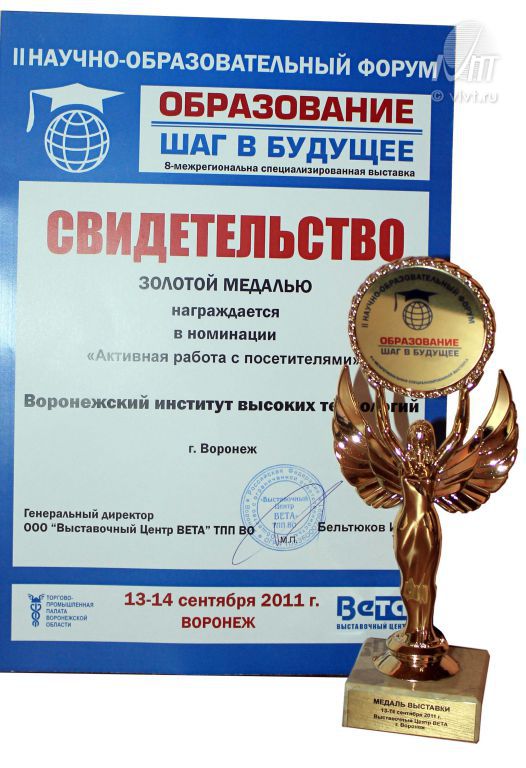 Воронежский институт высоких технологий получил золотую медаль выставки "Образование шаг в будущее".